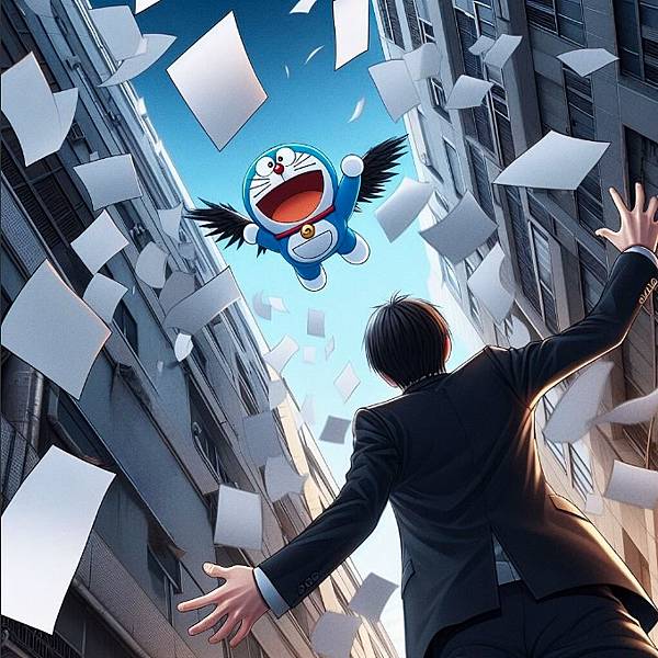 好幾張空白紙從天上掉下來。黑色翅膀的哆啦A夢,飛在50樓高的空中,神情冷淡。短髮男子舉起手想抓住空白紙。天黑街道的地上。緊張氣氛,細節精緻,寫實風格,仰望視角。