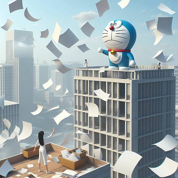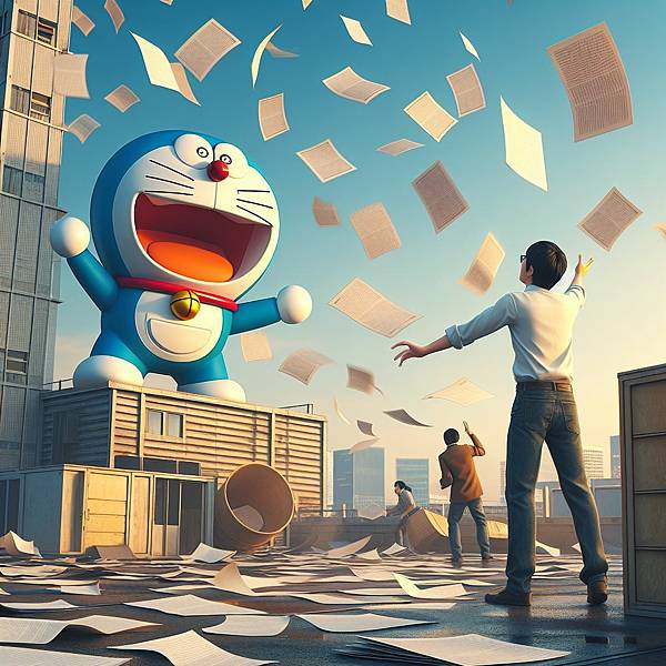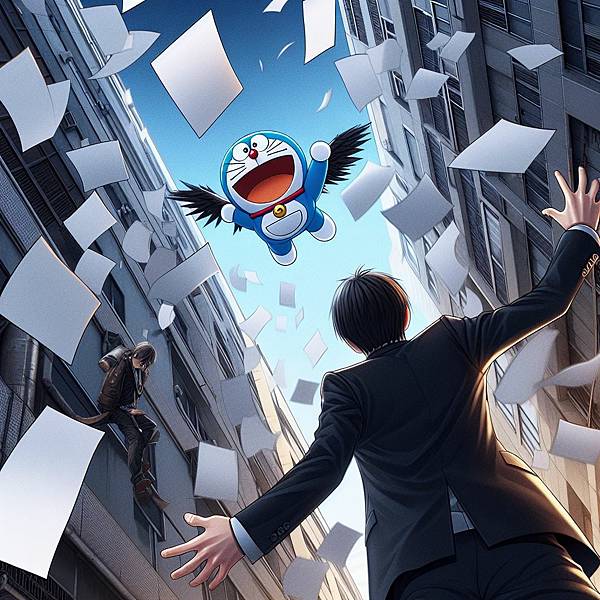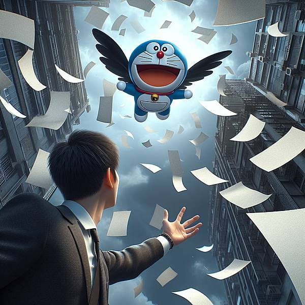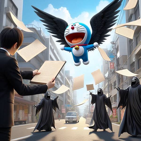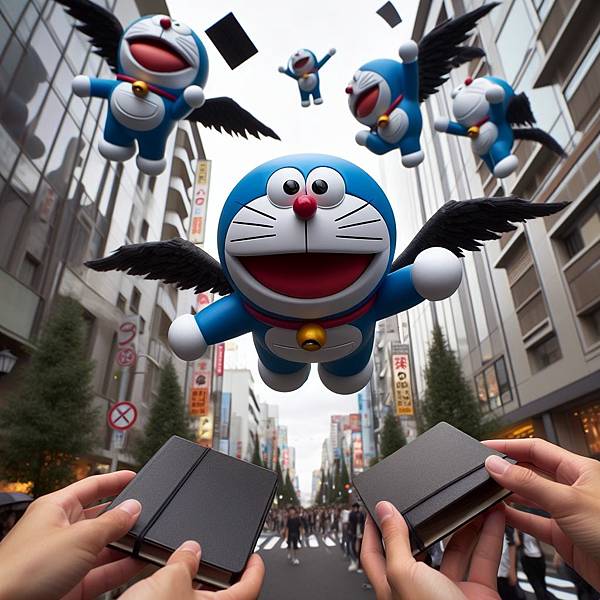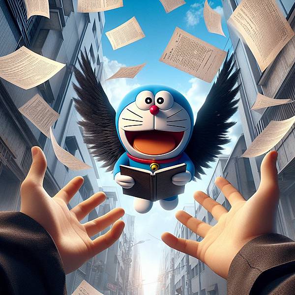 一開始想讓哆啦A夢戴竹蜻蜓飛,但是會變成獵奇圖片,只好加上了翅膀。
