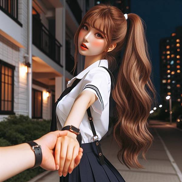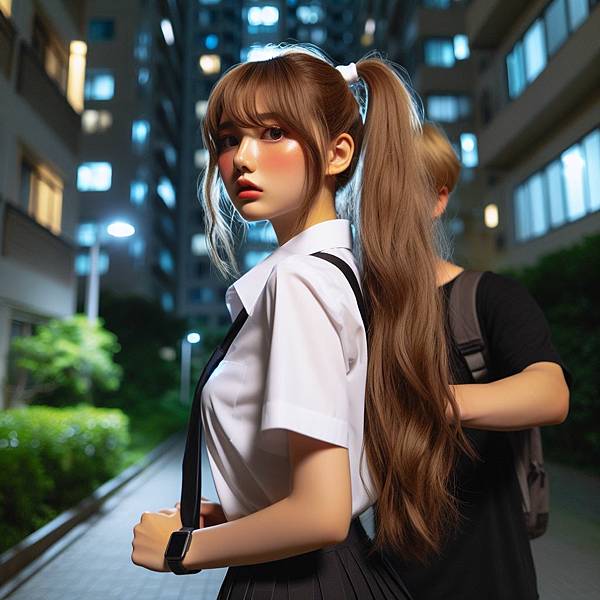 當我步行回家的路上經過一個住宅公寓大樓時,我注意到在大樓門口那,有一位銅紅色髮色的單馬尾女孩。