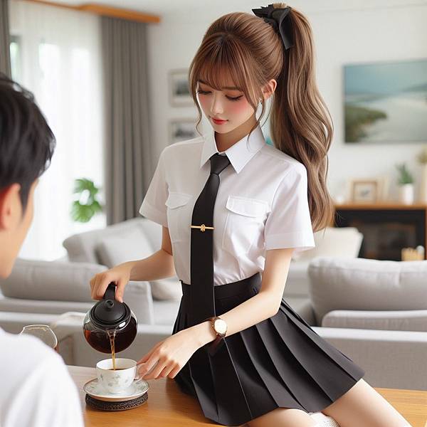 然而沒想到特別繞到我與客廳桌子之間,然後坐在桌子上替我倒紅茶。