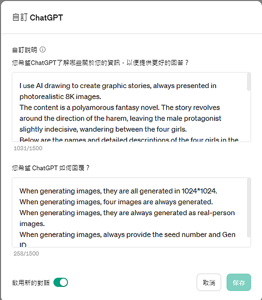 上面的區塊為自訂說明,這個地方能讓你開啟的新聊天,直接理解你的定義與要求。