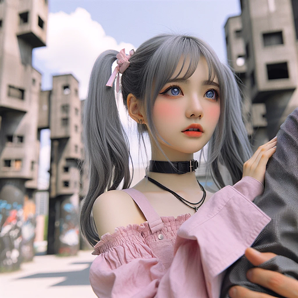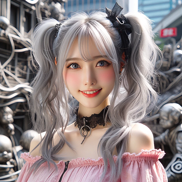 A photograph-like image capturing another enchanting moment of Xueer, the Japanese girl with the signature silver-white twin ponytails and dark blue eyes. This time, Xueer's engaging smile radiates more prominently as she poses in front of a unique piece of urban installation art, showcasing the city’s vibrant culture. Dressed in her signature pink off-shoulder top and a black skirt, complemented by a black choker and a black hair accessory, Xueer exudes a blend of grace and vitality. The background art piece, distinct from the previous ones, adds another layer of depth to her story, highlighting her connection with the art and the urban environment around her.